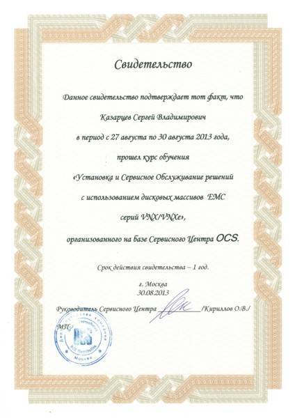 Нашим специалистом пройдена сертификация по установке и сервисному обслуживанию решений с использованием дисковых массивов EMC серий VNX/VNXe.
